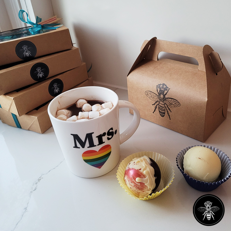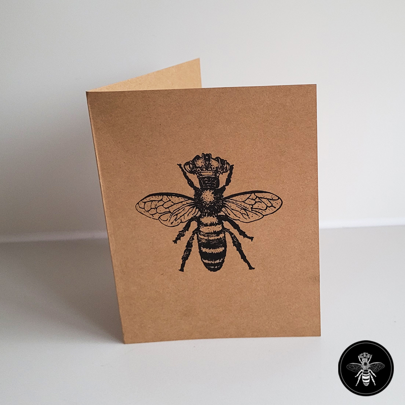 Front of the card includes a stamp with the original art Queen Bee Chocolatier logo. Envelope sealed with pink logo sticker.