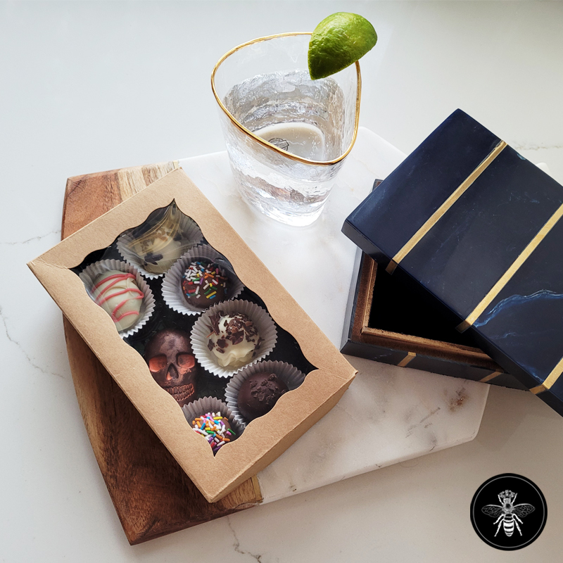 Assorted box of 8 fresh chocolate truffles & 1 signature Fuego Fuego skull (spicy Mexican chocolate).