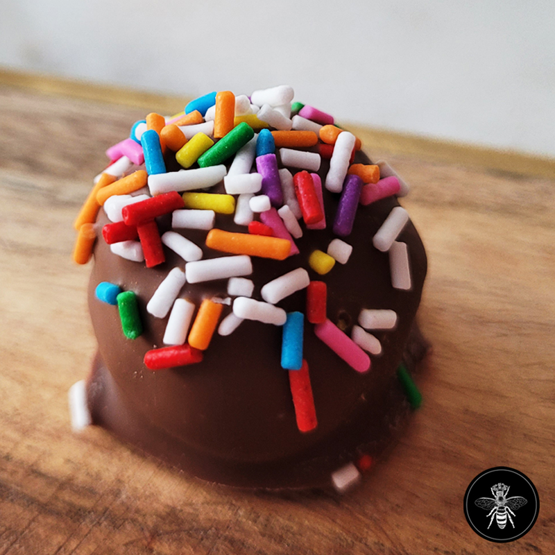 Milk chocolate rainbow sprinkle exterior with birthday cake flavour ganache interior